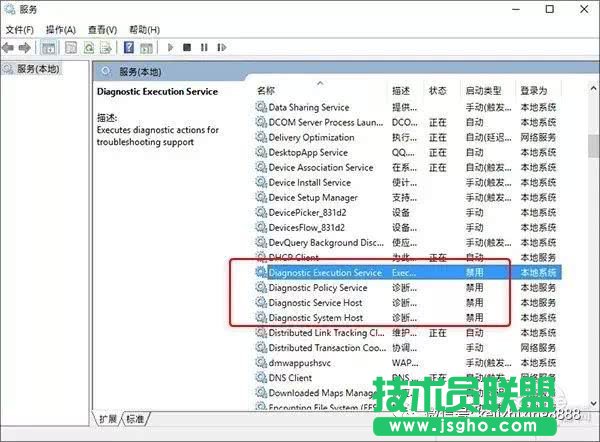 2. 右窗格隨意點(diǎn)擊一個(gè)服務(wù)項(xiàng),然后快速輸入“diag”。在這里需要我們修改的服務(wù)共有四個(gè),分別是“Diagnostic Execution Serice”、“Diagnostic Policy Serice”、“Diagnostic Serice Host”和“Diagnostic System Host”;