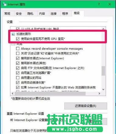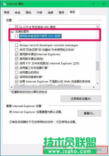 4、在Internet 屬性 - 高級選項下,可以看到:加速的圖形 - 使用軟件呈現而不使用GPU呈現前面的復選框內打了勾;