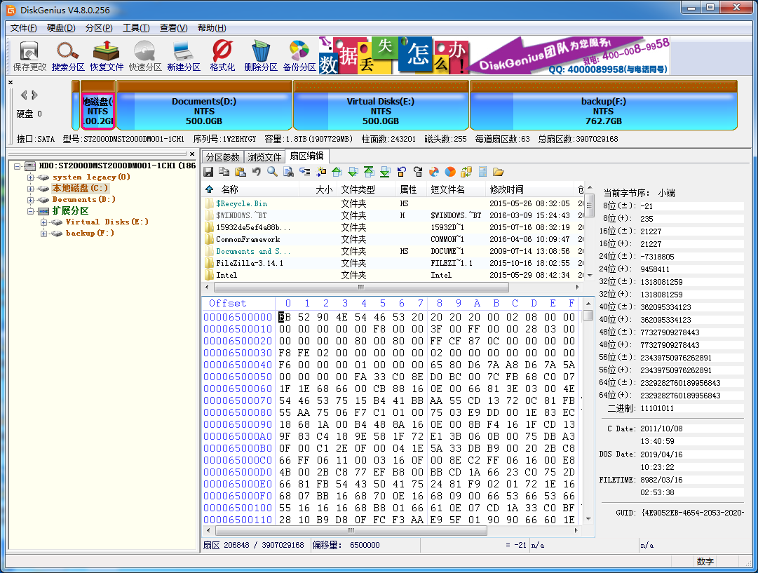 DiskGenius是一款磁盤管理及數據恢復軟件。支持對GPT磁盤(使用GUID分區表)的分區操作。除具備基本的建立分區、無損調整分區大小等功能外,還提供了已丟失分區恢復、誤刪除文件恢復、格式化恢復、分區備份與還原、克隆分區或硬盤、快速分區、檢查與修復分區表錯誤、檢測壞道與修復、扇區編輯、支持VMWare虛擬硬盤文件格式。